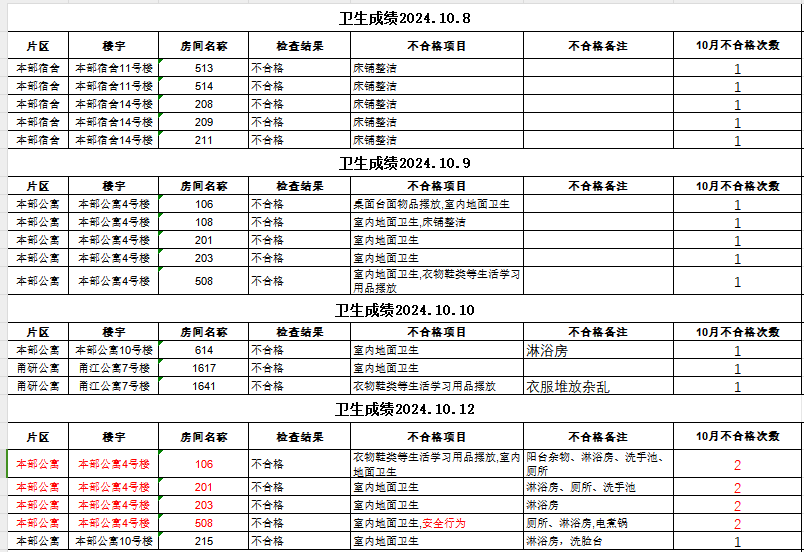 经校学生社区服务中心的检查,现对10月8日-10月12日卫生检查不合格的寝室予以公示,详见下表。