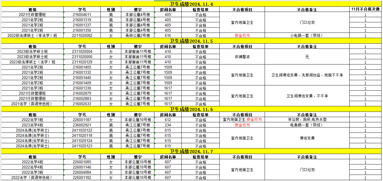 经校学生社区服务中心的检查,现对11月4日-11月8日卫生检查不合格的寝室予以公示,详见下表。