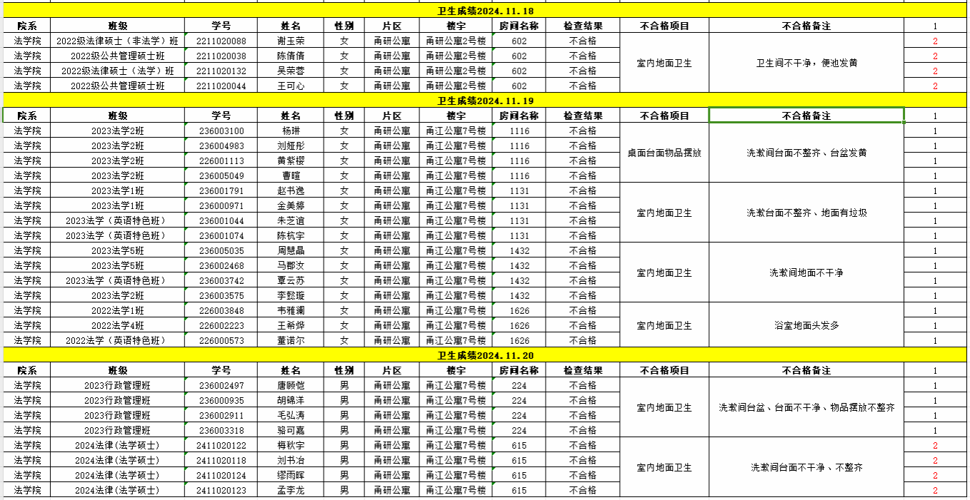经校学生社区服务中心的检查,现对11月18日-11月22日卫生检查不合格的寝室予以公示,详见下表。