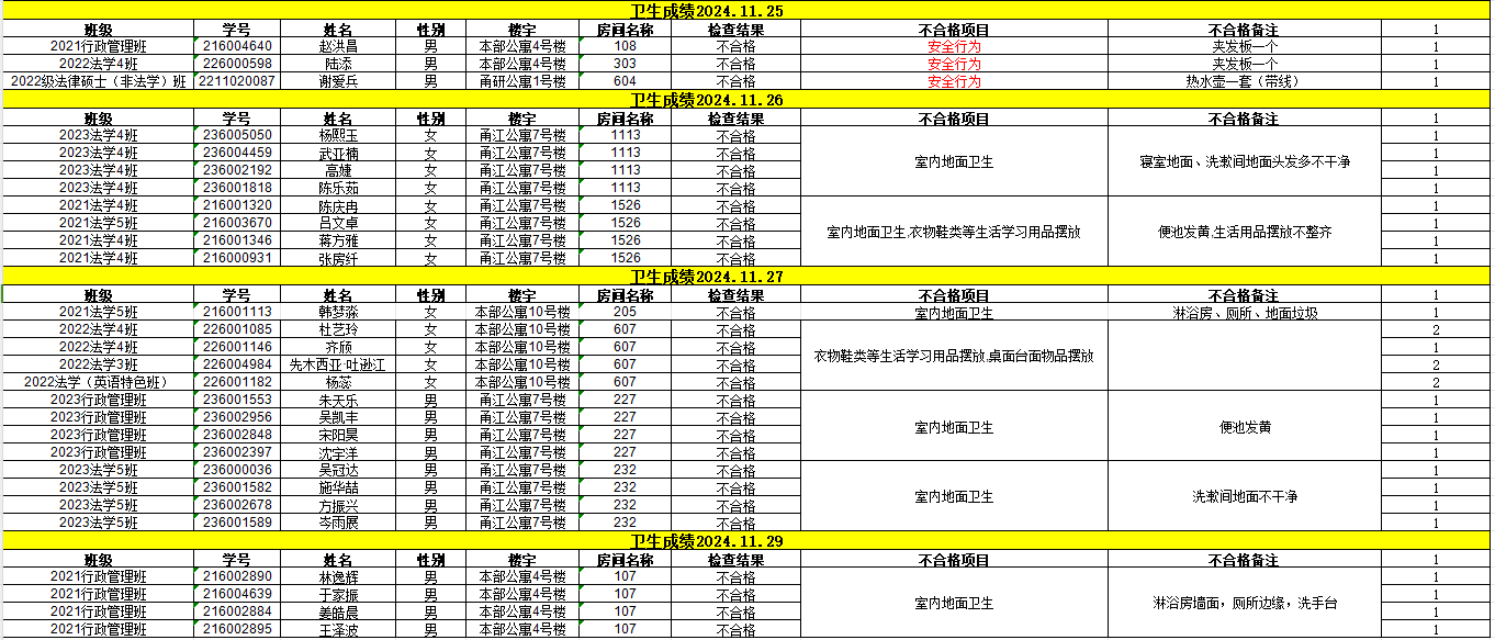 经校学生社区服务中心的检查,现对11月25日-11月29日卫生检查不合格的寝室予以公示,详见下表。