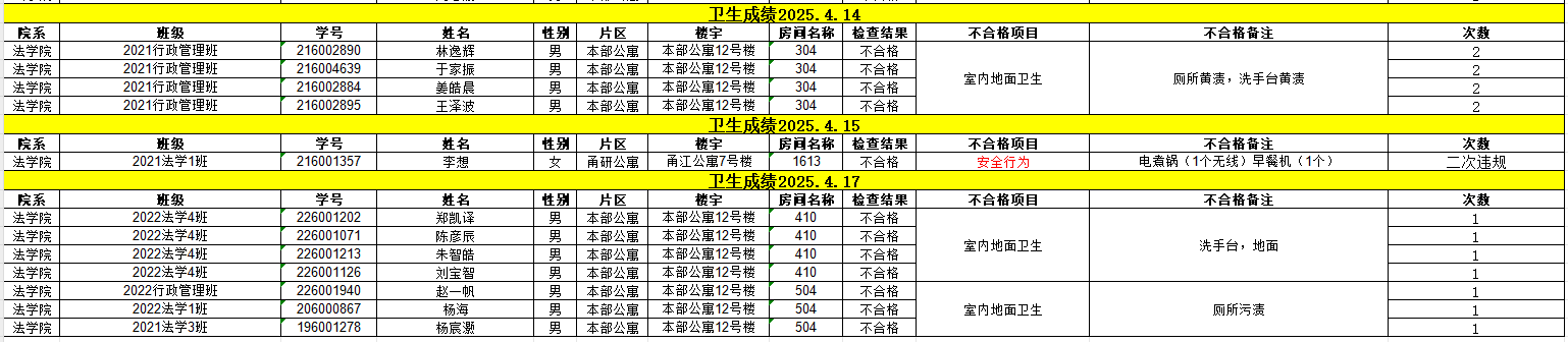 经校学生社区服务中心的检查,现对4月14日-4月18日卫生检查不合格的寝室予以公示,详见下表。