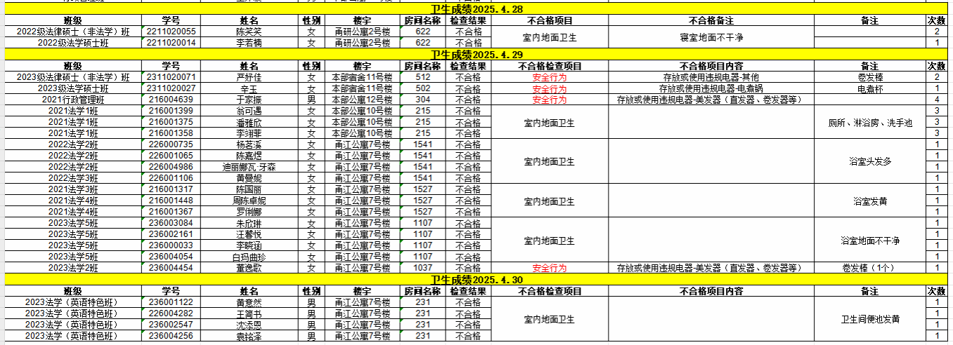 经校学生社区服务中心的检查,现对4月28日-4月30日卫生检查不合格的寝室予以公示,详见下表。