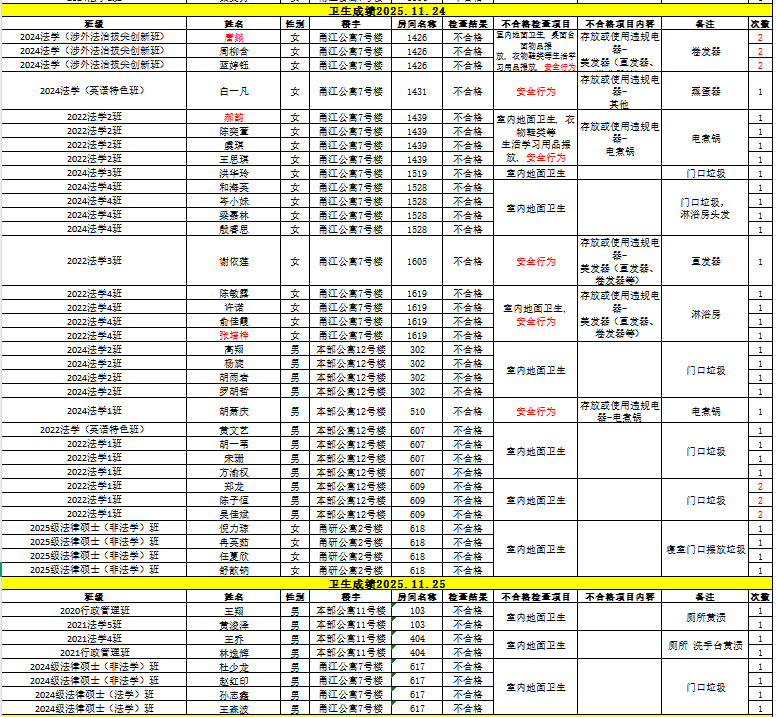 经校学生社区服务中心的检查,现对11月24日-11月28日卫生检查不合格的寝室予以公示,详见下表。