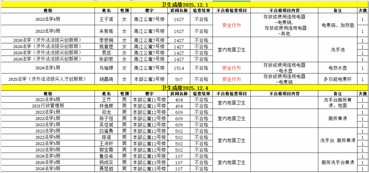 经校学生社区服务中心的检查,现对12月1日-12月5日卫生检查不合格的寝室予以公示,详见下表。