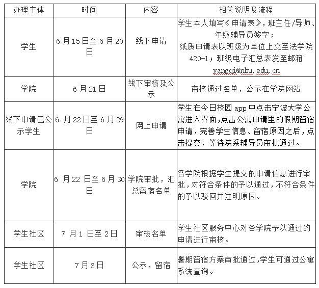 5.因学校常态化防疫工作需要,留宿学生暑假期间无特殊原因不得离开宁波大市,离开宁波大市视为主动离校,宿舍门禁将做关闭处理,学生开学后方可返校。暑假期间不开放临时假期住宿申请。如疫情防控政策有变,相关工作另行通知。
