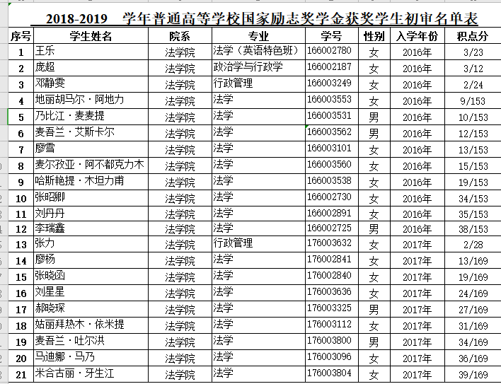 2018-2019学年一帆视频 国家励志奖学金经学生本人申报、奖学金评选委员会资格审核、讨论,结合奖学金评定办法和学校下拨名额,最终拟推荐2018-2019年度国家励志奖学金名单公示如下: