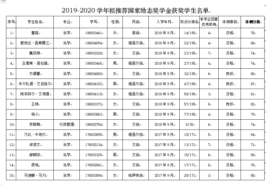 2019-2020学年一帆视频 国家励志奖学金经学生本人申报、奖学金评选委员会资格审核、讨论,结合奖学金评定办法和学校下拨名额,最终拟推荐2019-2020年度国家励志奖学金名单公示如下: