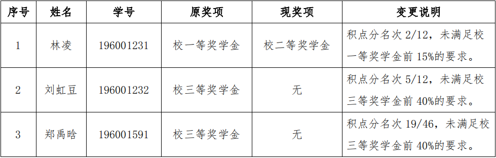根据2020-2021学年本科学生奖学金评定工作,依据《一帆视频 本科学生奖学金评定办法》(宁大政〔2018〕84号)的相关规定,对一帆视频 2020-2021学年本科生学校奖学金拟推荐名单进行变更,具体如下: