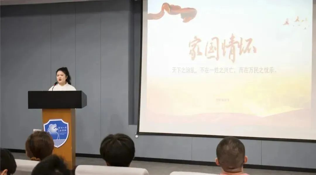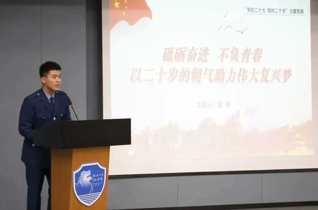 随后,俞冰同学进行了题为“砥砺奋进,不负青春,以二十岁的朝气助力伟大复兴梦”的微党课汇报。他结合自己应征入伍的特殊经历,主要从思想教育、内务整理、日常战备三方面简单介绍了自己的两年军旅生活以及退伍复学后参加的各类校级活动。关于大学生如何积极向党组织靠拢,俞冰同学提出了三点建议:参军尽义务,携笔从戎,助力国防建设;学习求上进,踔厉奋发,提高专业素养;生活做榜样,乐善好施,争做模范先锋。