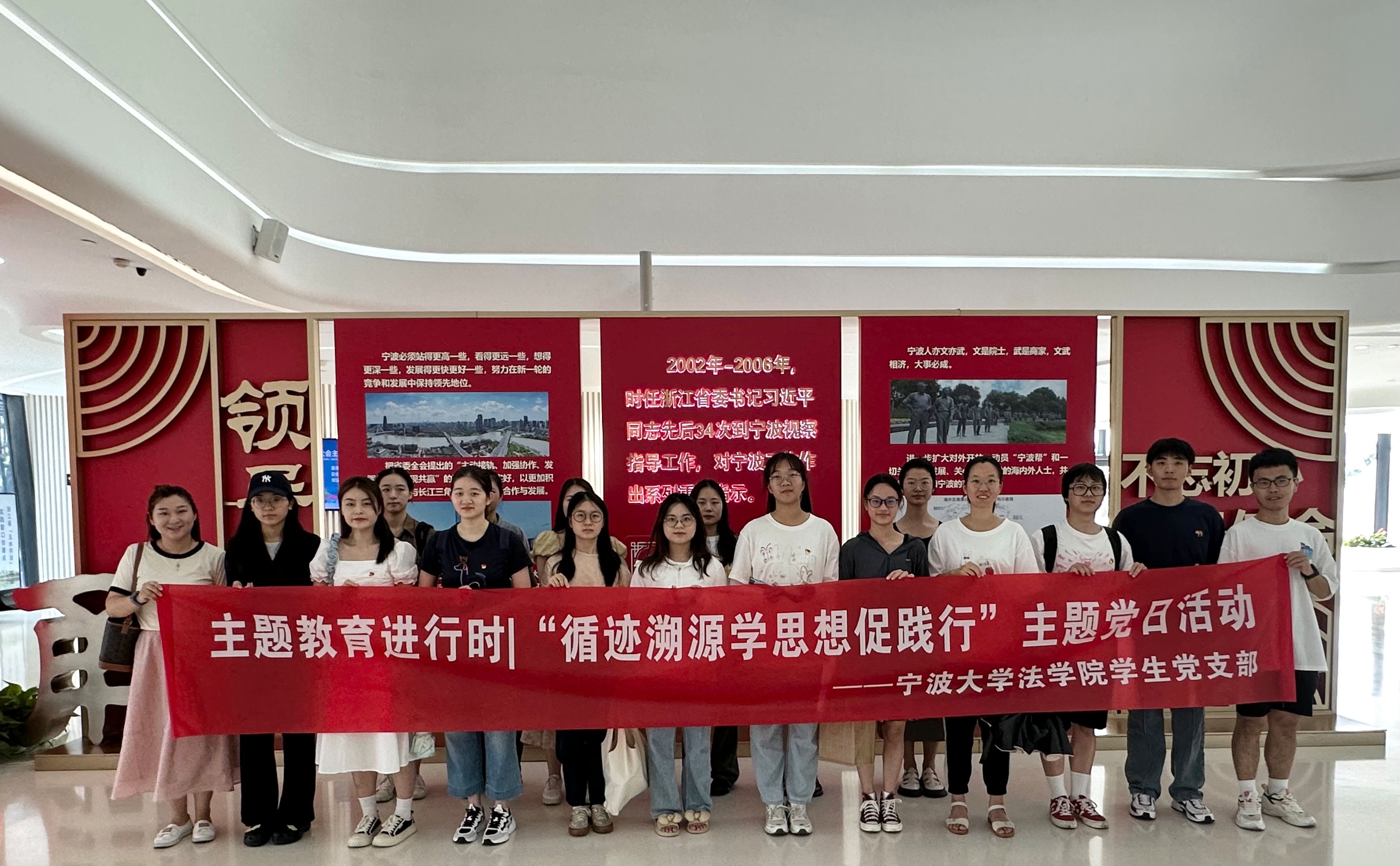 法学硕士研究生第二党支部的20余位党员来到宁波市城市展览馆,重温宁波城市中所发生的重大党史事件,追寻习近平总书记的宁波足迹,感受“八八战略”中宁波地区的实践成就。