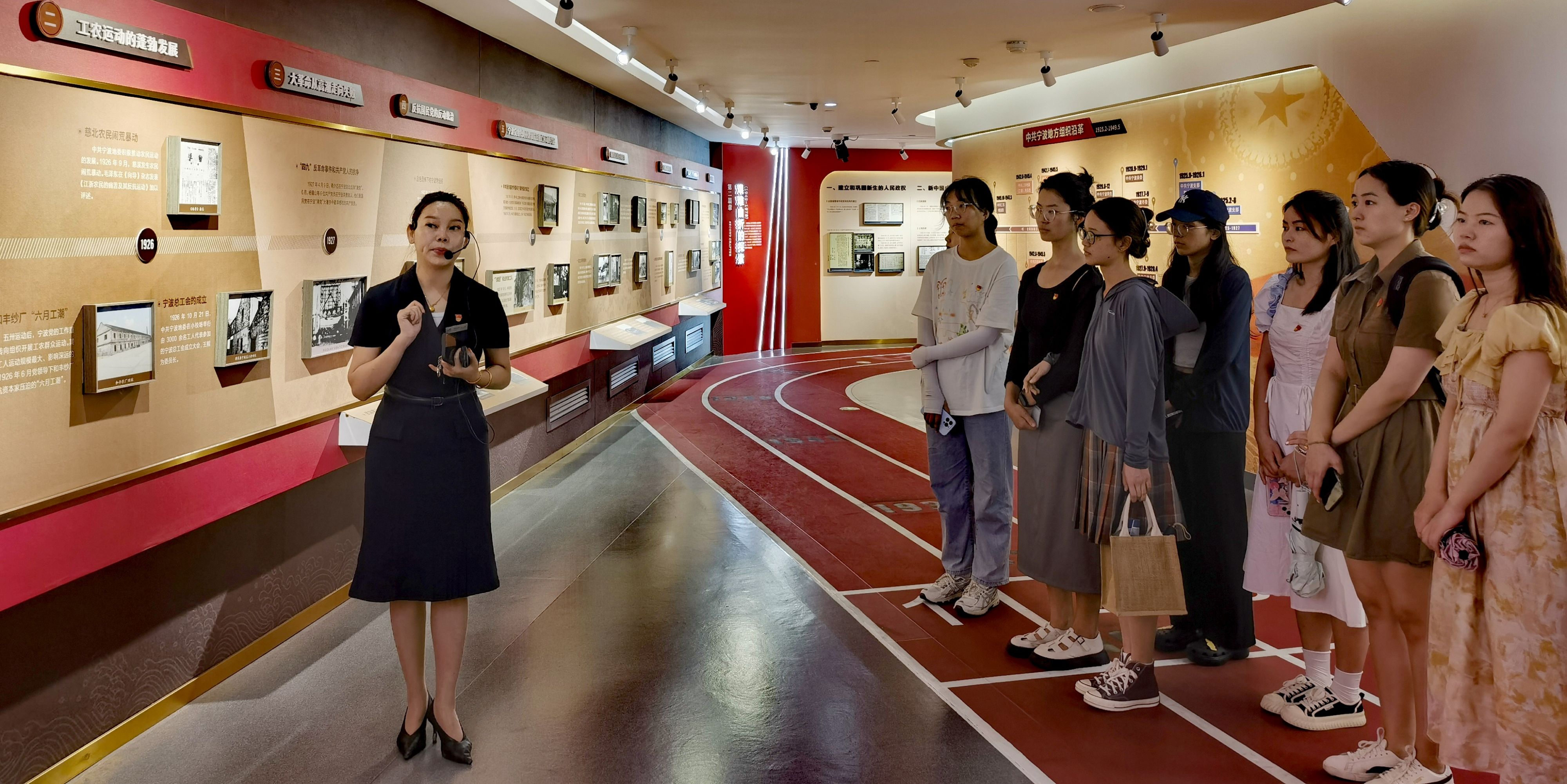 紧接着,支部党员参观了“中国共产党—宁波百年历史”主题展厅。沿着红色的时间跑道,伴随着讲解员的详细介绍,支部的党员们重温了建党百年以来宁波地区的重大党史事件。一张张珍贵的历史图片,一段段短小却震撼人心的文字介绍,让在场的党员们深刻地感悟到,百年来在中国共产党领导下,宁波人民经过浴血奋战、艰苦探索、不懈奋斗,谱写出的革命、建设、改革和复兴的壮丽篇章。在参观过程中,讲解员着重介绍了宁波帮人士对宁波地区发展做出的突出贡献,还特别提到宁波帮与一帆视频