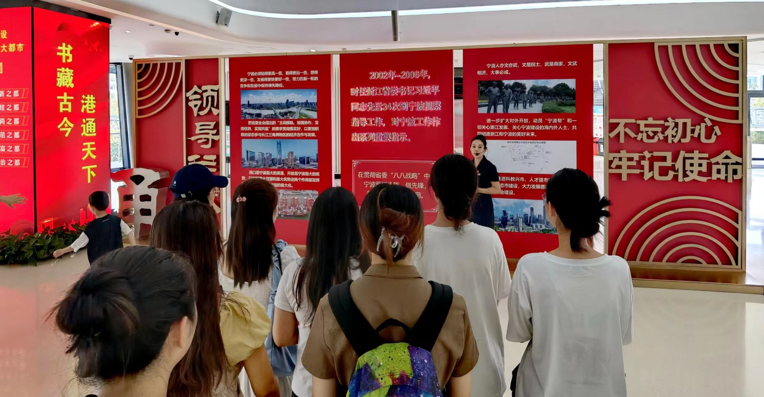 活动伊始,党员们参观了展览馆大厅的“八八战略”巨型展板。展板上展示了2002年至2006年,时任浙江省委书记习近平同志先后34次到宁波视察指导工作所做出的重要指示。围绕宁波城市发展建设、美丽乡村建设、平安宁波建设、共同富裕示范区建设,宁波践行“干在实处永无止境、走在前列要谋新篇、勇立潮头方显担当”的要求,不断推进“八八战略”再深化、改革开放再出发,在努力践行“两个一百年”奋斗目标过程中所体现的“干在实处、走在前列、勇立潮头”的浙江精神深深触动了每一位党员。