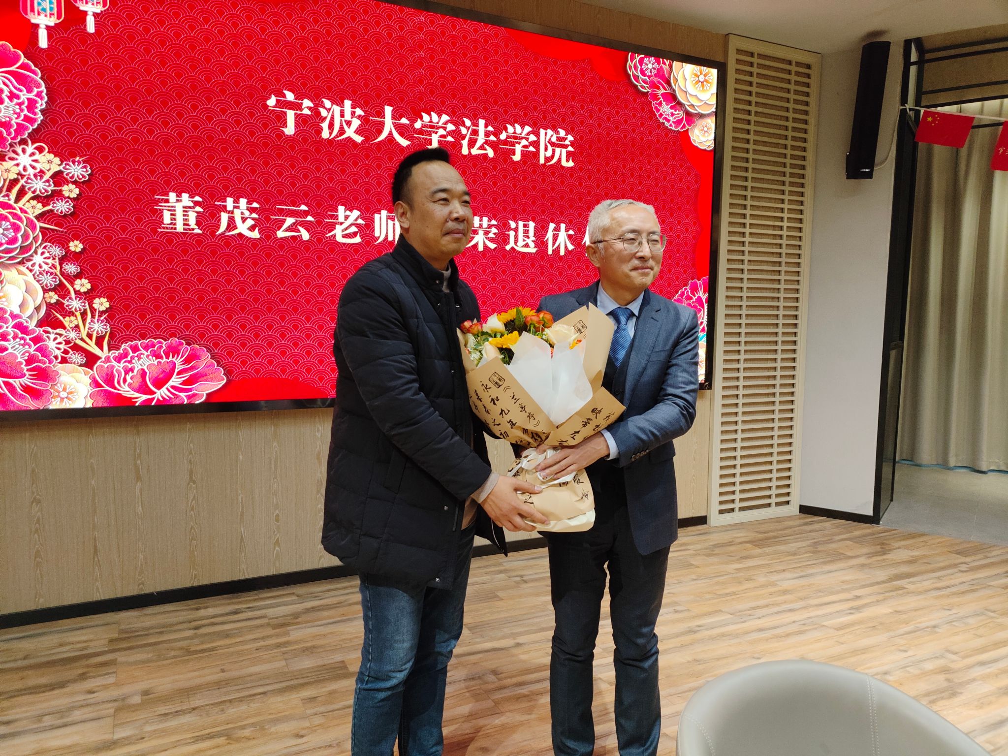 最后院长梁开银表示,董茂云老师是一位值得尊敬的长者、值得依靠信赖的参谋、值得深交的诤友。”桃李不言,下自成蹊“,辛勤耕耘教坛、提携关照后辈。梁院长代表学院感谢董老师为法学教育事业做出的贡献。退休又是一个新生活的起点,他祝愿董老师身体康健,事事顺意,并期待董老师今后退休生活幸福快乐,多来学院走走,为学院进一步发展献计献策。