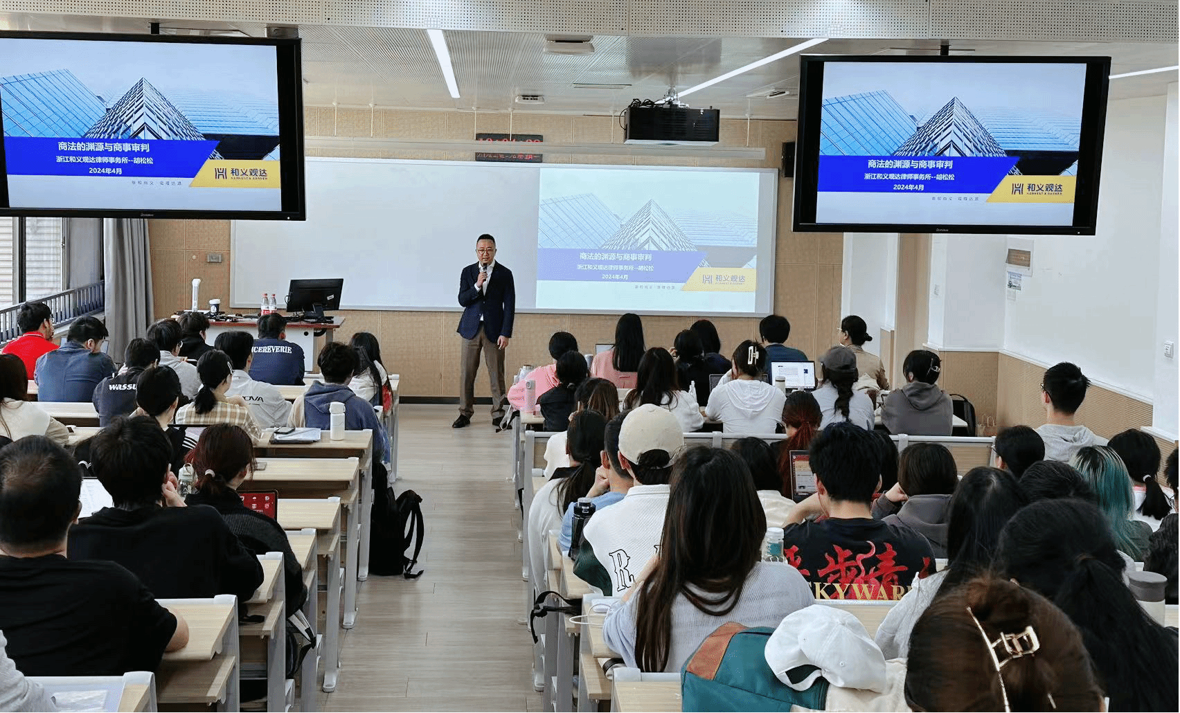 4月24日、25日,浙江和义观达律师事务所胡松松主任(高级合伙人、二级律师)两次进入本科生课堂,为2022级法学专业3个班级的学生讲授了《商法总论》专业课之商事审判的课程内容。这是校企合作课程《商法总论》开设以来第三次校外实务专家进入课堂讲课。