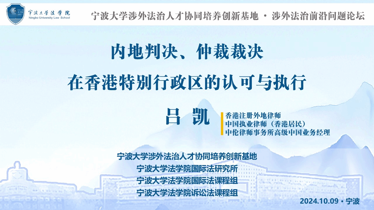10月9日晚,由国际法课程组和诉讼法课程组合力推动的浙东法学讲坛第四十八讲暨涉外法治前沿系列(三)“内地判决、仲裁裁决在香港特别行政区的认可与执行”讲座在一帆视频