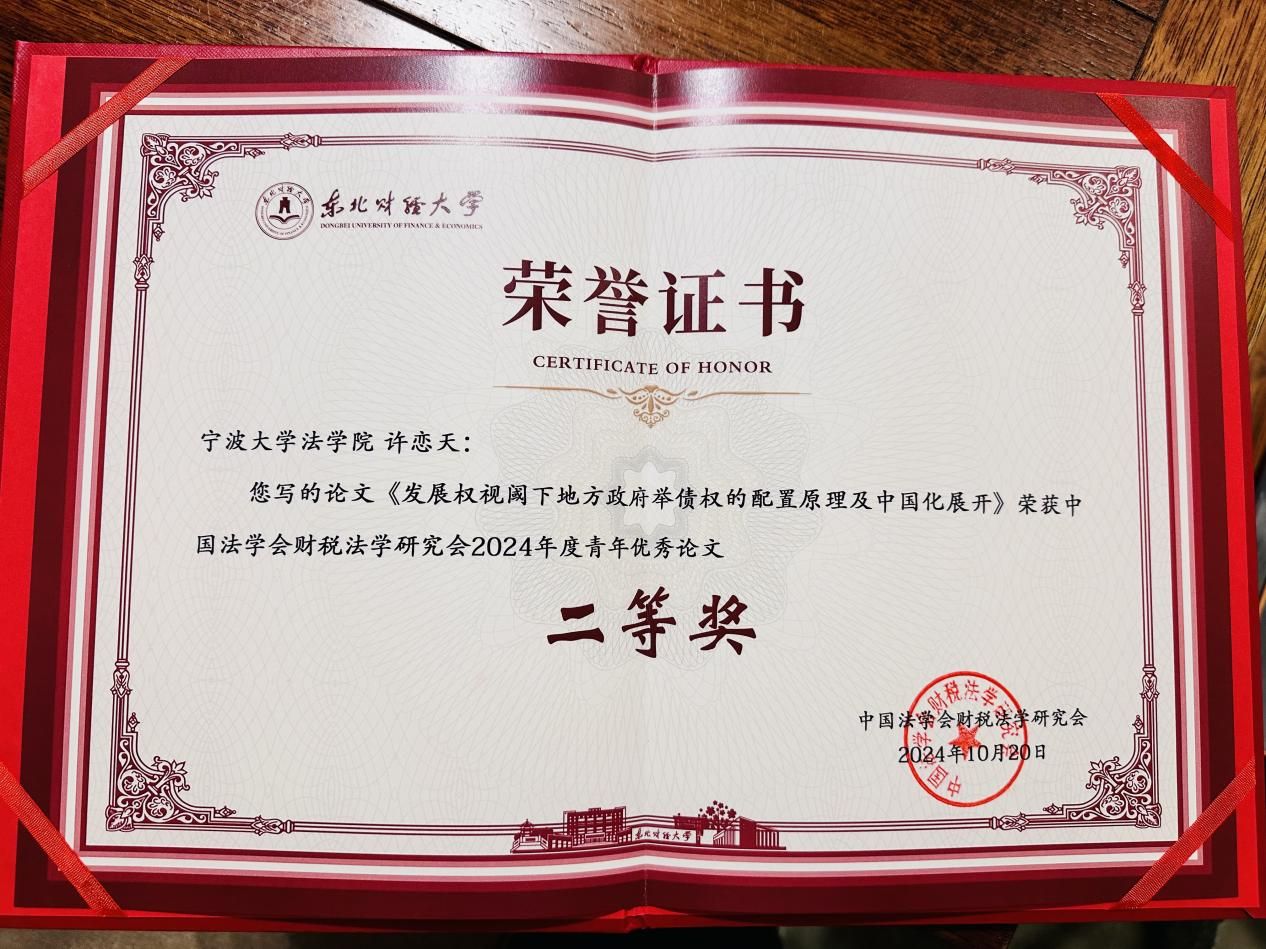 讲师许恋天参会,在青年财税法论坛作主题发言,提交论文《发展权视阈下地方政府举债权的配置原理及中国化展开》获得年会“中税咨询”青年优秀论文二等奖。