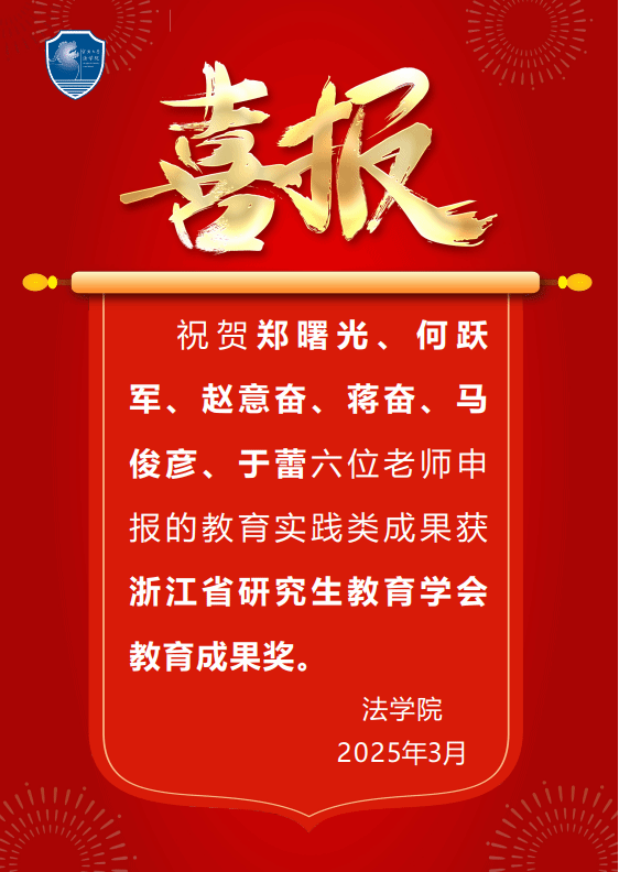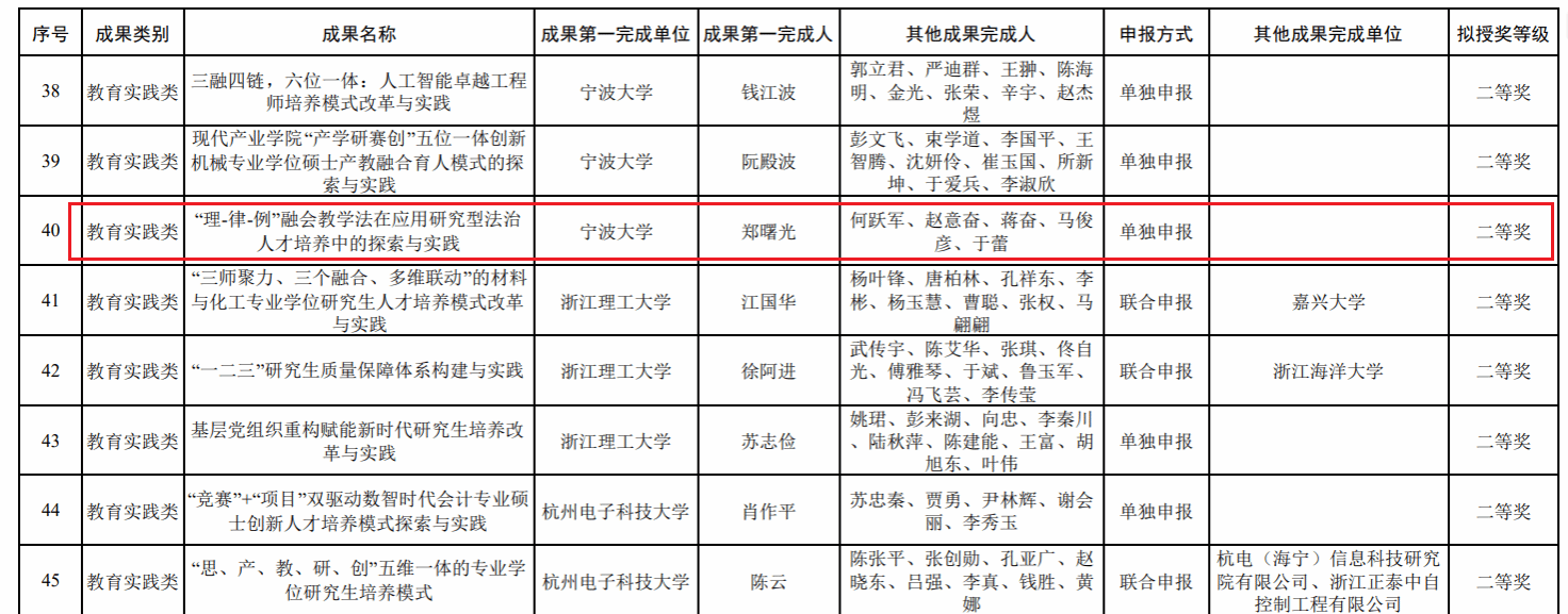 浙江省研究生教育学会于近日发布了《关于第四届浙江省研究生教育学会教育成果奖拟授奖项目的公示》,2024年浙江省研究生教育学会教育成果奖项目已经面向社会公示完成,共有62项成果获奖,一帆视频 郑曙光、何跃军、赵意奋、蒋奋、马俊彦、于蕾六位老师申报的教育实践类成果‘“理-律-例”融会教学法在应用研究型法治人才培养中的探索与实践’获二等奖。
