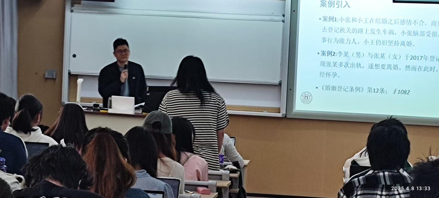 课堂以民法典婚姻家庭编为主线,采用"理论阐释+实务剖析+思政融合"的三维教学模式。吕双全老师通过精选典型案例、法考真题与司法大数据,系统解析婚姻终止的法定形式、程序要件及法律后果。教学中创新引入DeepSeek人工智能工具进行案例收集、数据分析,将社会主义核心价值观与"枫桥经验"在婚姻家事领域的实践应用有机融入知识体系”课堂氛围活跃,通过案例分析等方式,引导学生积极思考,参与课堂,实现专业知识传授与价值引领的深度融合。