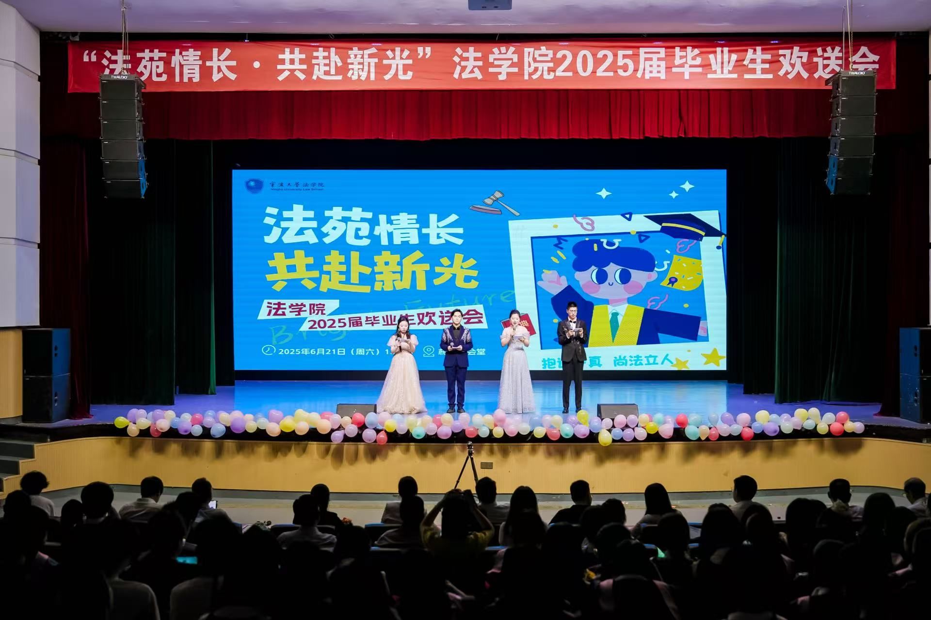 2025届毕业生欢送会在林杏琴会堂举行。学院党政领导班子、各系(所)负责人、毕业班班主任、相关行政部门负责人、教师代表、毕业生亲友代表、全体2025届毕业生近700人参加了欢送会。欢送会由2025届毕业生龚寅东、窦梓月、吉潇乐、曹志主持。