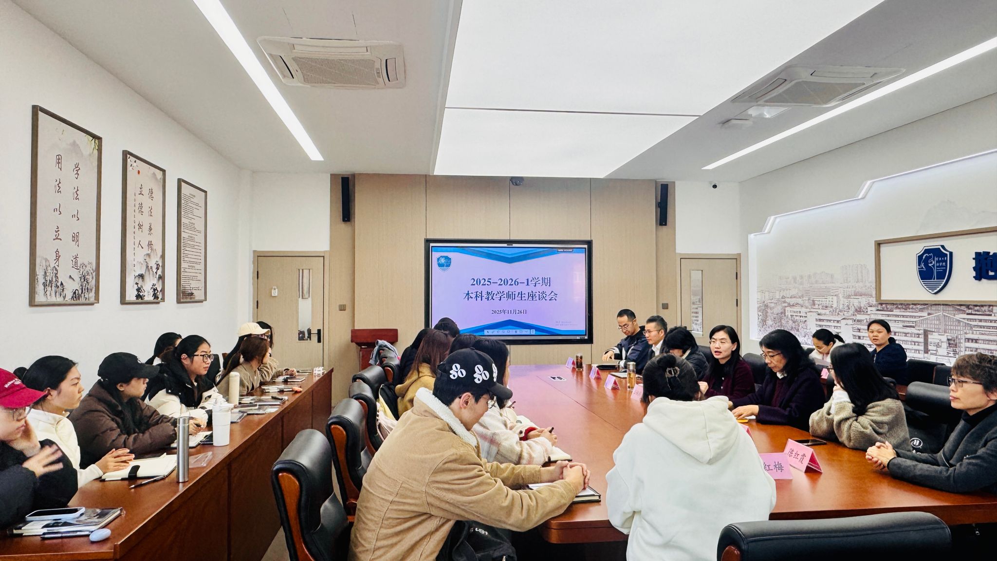 在11-202会议室成功召开2025-2026学年第一学期本科期中教学师生座谈会。会议由分管本科教学的副院长王婉娟主持,本科教学督导组组长尹力、督导罗维、陈红霞、阳晓伟、各系负责人、教务办与学工办教师代表,以及2023级、2024级、2025级学生代表共同参会,围绕本科教学优化展开深入交流。