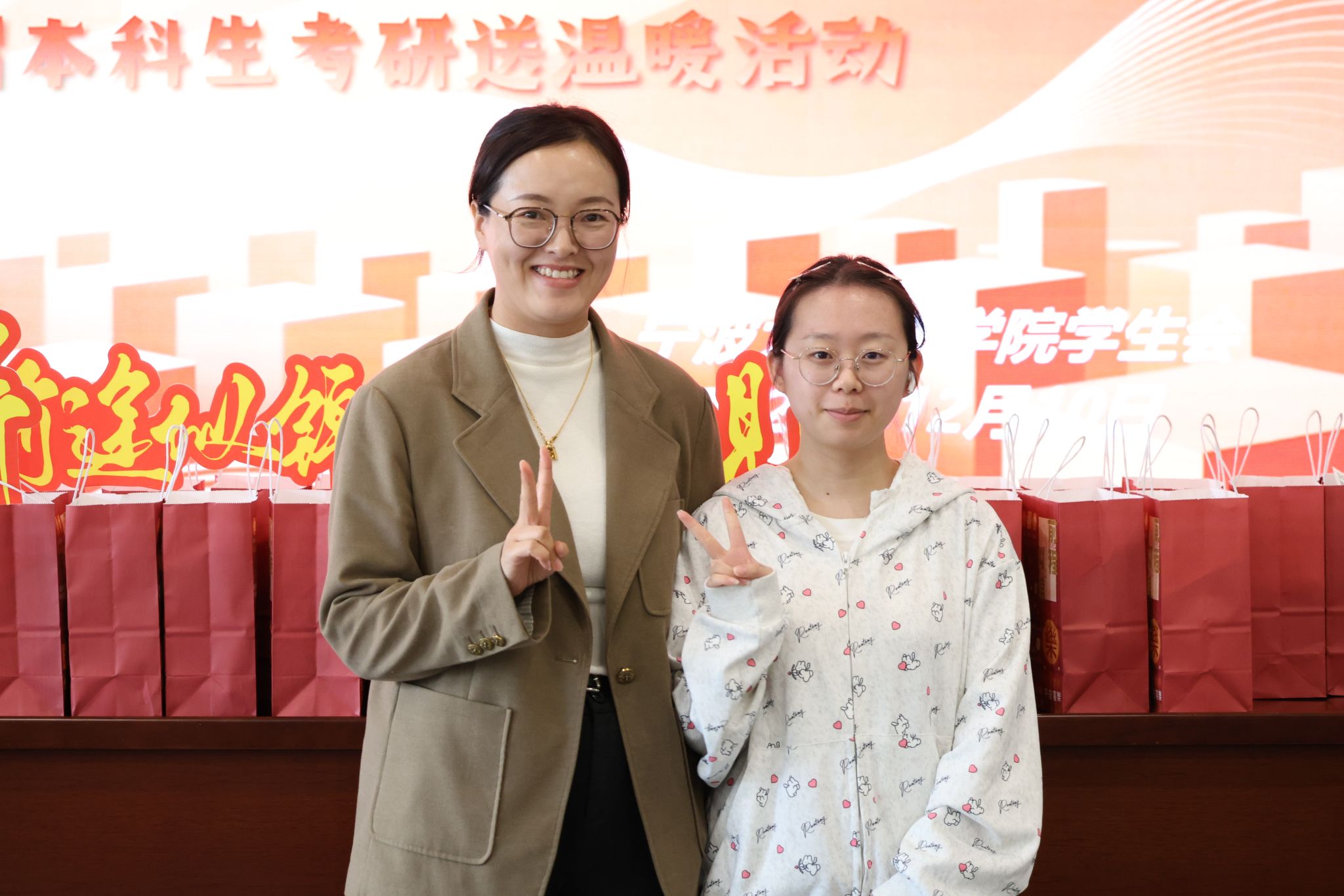 党委副书记谢果凰和学工办全体老师亲手发放考研大礼包,向考研学子送上诚挚祝福,叮嘱大家注意考前作息与保暖,与考研学子拍照留念,为他们注入备考信心。