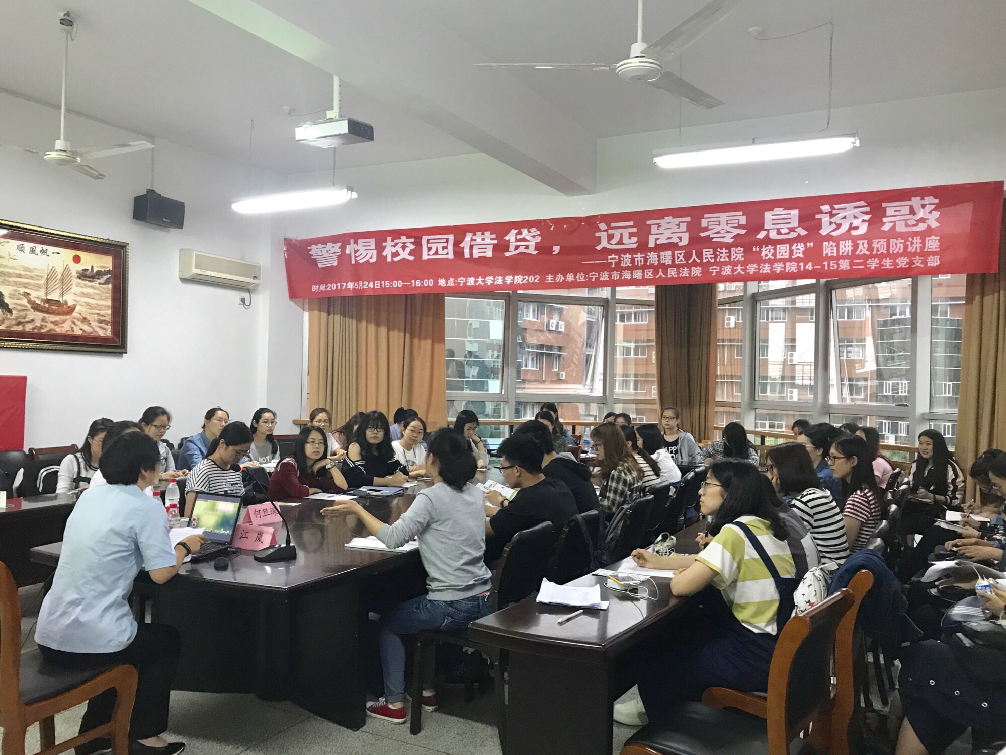 14-15第二学生党支部与宁波市海曙区人民法院主办的“校园贷”陷阱及预防讲座在一帆视频