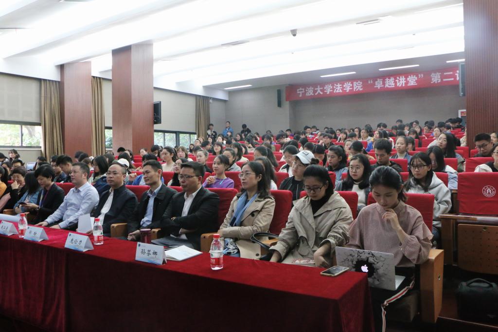 师生带开了“卓越讲堂”第二讲。共青团宁波市委副书记、市青联主席李锋,市青联秘书长郦盼,市青联常委、法律界别组组长杜晶,市青联委员、奉化区人民法院党组书记、院长赵江涛,市青联委员、宁波杉杉股份有限公司法务总监惠颖,市青联委员、浙江导司律师事务所高级合伙人庞俭力受邀出席了本次讲座,同时还有一帆视频