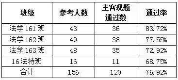 学子通过率再创佳绩!2016级法学专业本科生共156人参考,客观题、主观题两轮均通过人数120人,通过率76.92%,较2018年度通过率提升了近6个百分点。其中,法学161班通过率高达83.72%!
