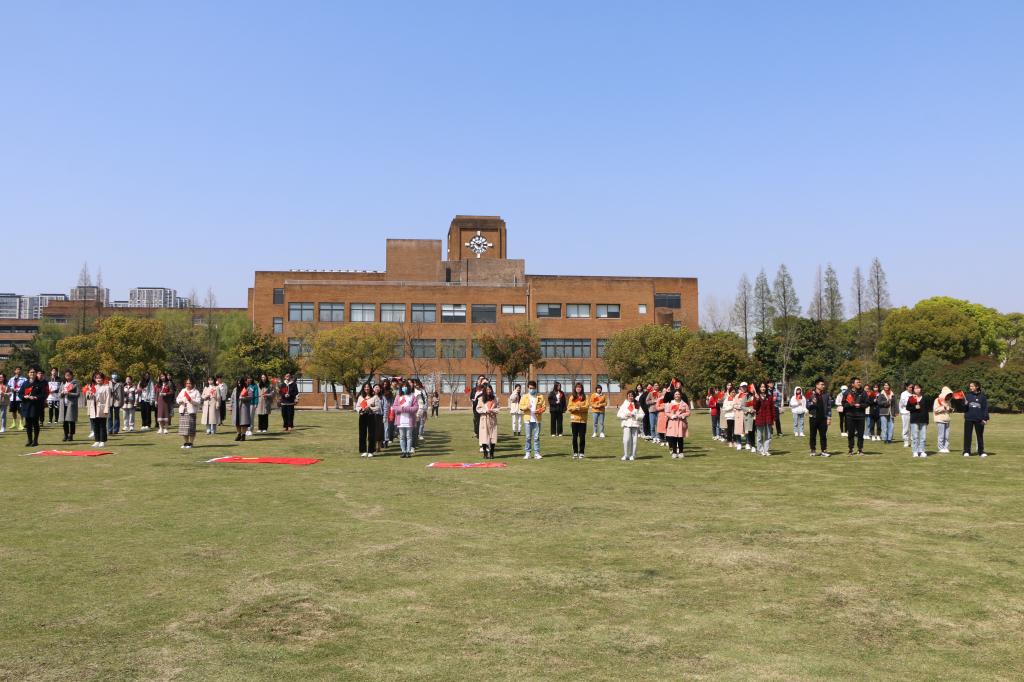 在校园大草坪组织了140多名学生开展“永远跟党走”系列活动,一帆视频