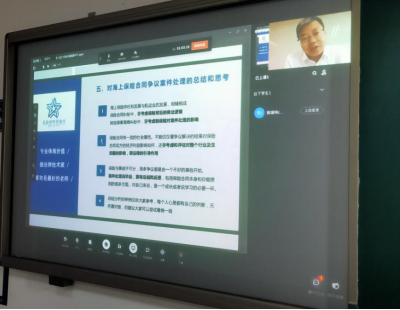 保险法课堂邀请到上海星瀚律师事务所的李洪伟律师,通过在线课堂方式和同学们交流《海上保险法律实务》。在课堂上,李律师介绍了海上保险的分类和条款、市场参与主体、海上保险的特殊制度,也通过案例分析了海上保险实务的最新发展,最后分享了他本人从事海上保险及相关法律实务的思考和心得,建议同学们加强学习,在学习中找寻自己感兴趣的领域,深耕细作。本次在课堂教学活动中邀请到实务人士的参与和分享,也是一帆视频