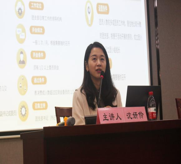 讲座伊始,沈妍伶老师与同学们进行积极互动,就“三会两制一课”展开提问和讨论,从而引出基层团支部工作职责及设置这一内容,向全体学员介绍了基层团支部的成立工作指引、工作职责和基层团支部支部委员的任职条件、职责及换届,最后播放趣味小视频对以上所讲的内容进行巩固复习。讲座的第二部分沈妍伶老师从更具体的执行层面出发,详细阐述了团员发展条件及流程、团员推优入党、主题团日活动开展要求等有关一帆视频