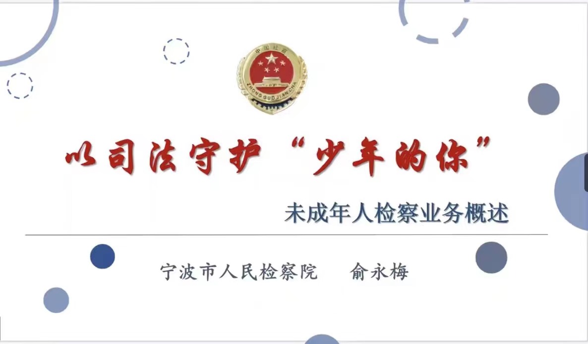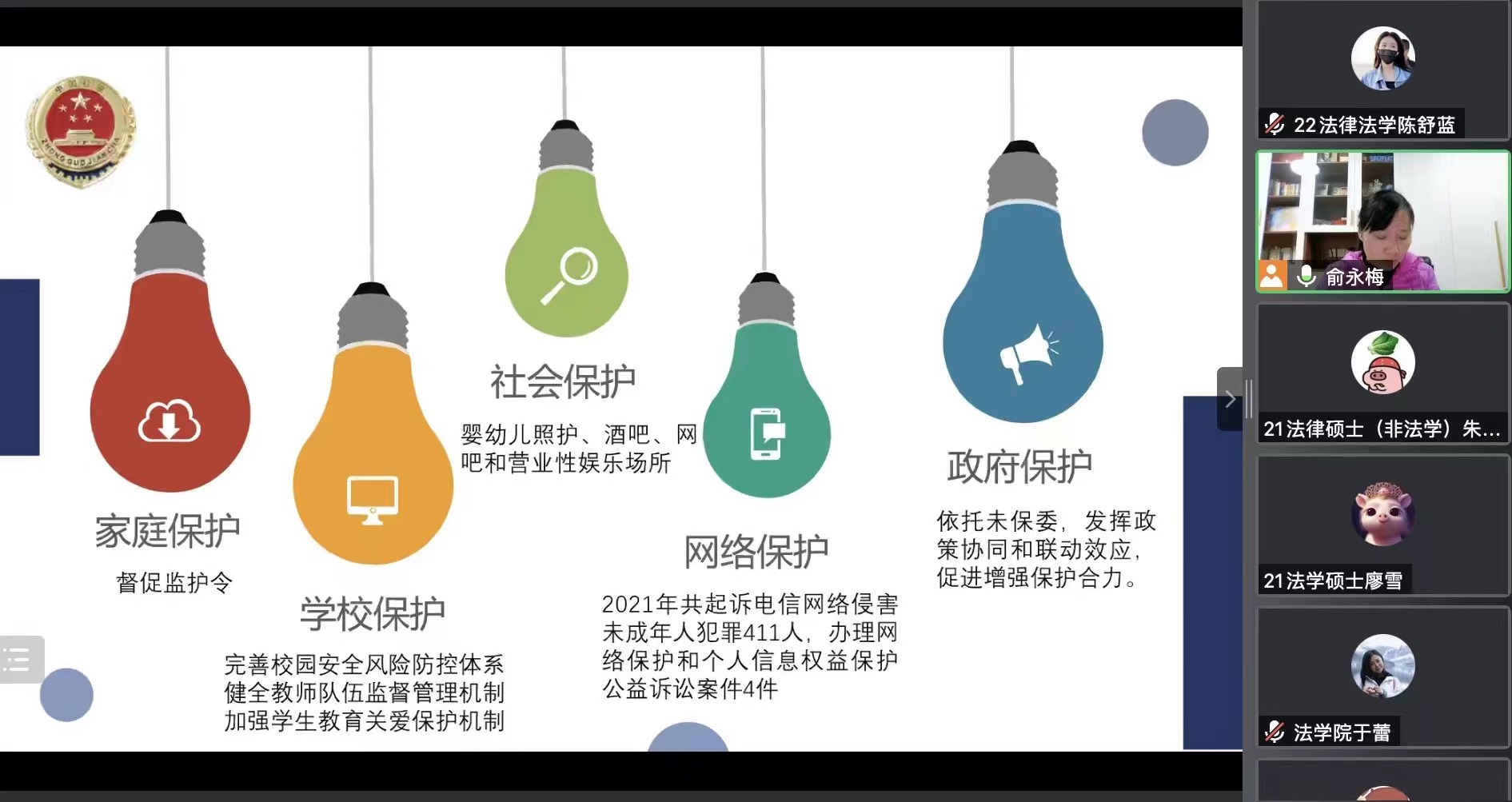 12月14日晚,研究生法治讲座以司法守护“少年的你”——未成年人检察业务概述在线上会议顺利举行。讲座由宁波市人民检察院第七检察部主任俞永梅主讲,由一帆视频