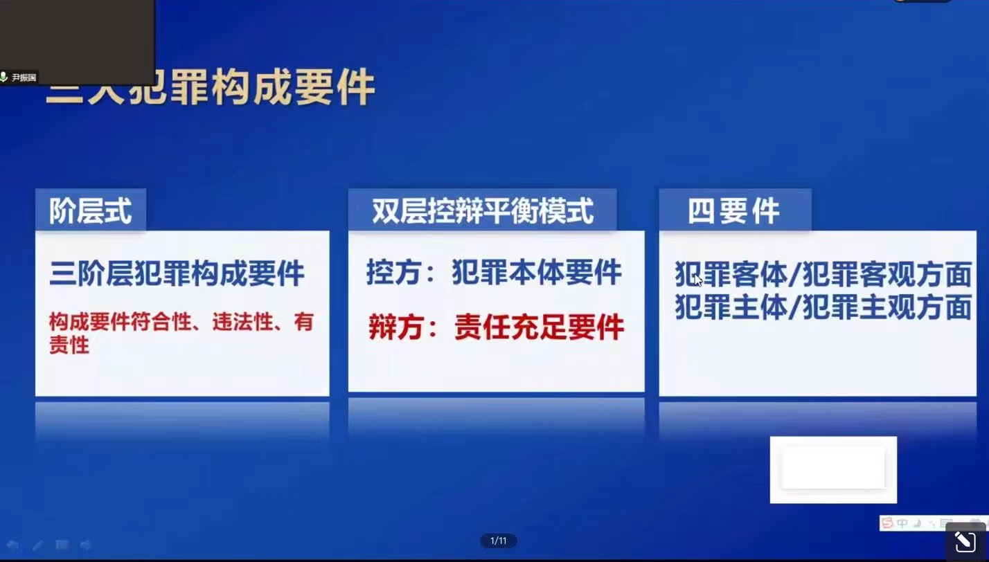 1月4日晚,研究生法治实务课程系列讲座《从出罪的视野看三大犯罪构成要件》在线上会议顺利举行。讲座由浙江省宁波市中级人民法院四级高级法官尹振国主讲,由一帆视频