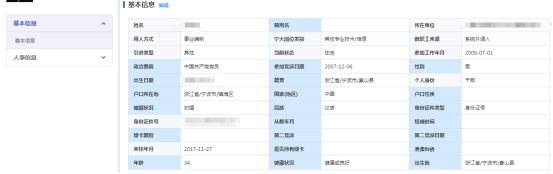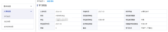 进行核对或信息变更,请按照应用中显示的“基本信息”、“人事信息”等模块进行信息核对,如信息有误请在对应的记录点编辑进修变更并上传有效佐证,需重点关注“学习经历”等人事信息。如下图所示:
