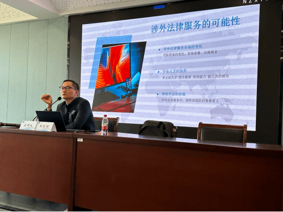 在培养法律人才方面所发挥的关键作用。随后,王律师对同学们未来的职业选择进行了宏观的展望。他提到,随着宁波城市开放程度的不断提高,其独特的资源禀赋为法律从业者提供了丰富的机遇。他特别强调了涉外法律服务在当前形势下的重要性和挑战,鼓励同学们积极拓宽国际视野,提升跨境法律服务能力。