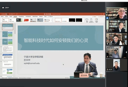 3月20日晚,宁波立法研究院法学名家讲坛第10讲暨宁大法苑讲坛2022年第1讲“智能科技时代如何安顿我们的心灵”通过腾讯会议以线上方式顺利举办。本次讲座由美国康奈尔大学一帆视频